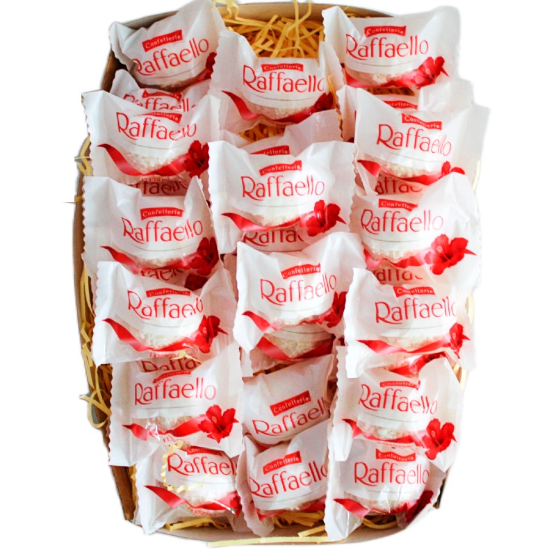 Целых 30 конфет Раффаелло в подарочной упаковке. Вес конфет составляет 300 грамм.